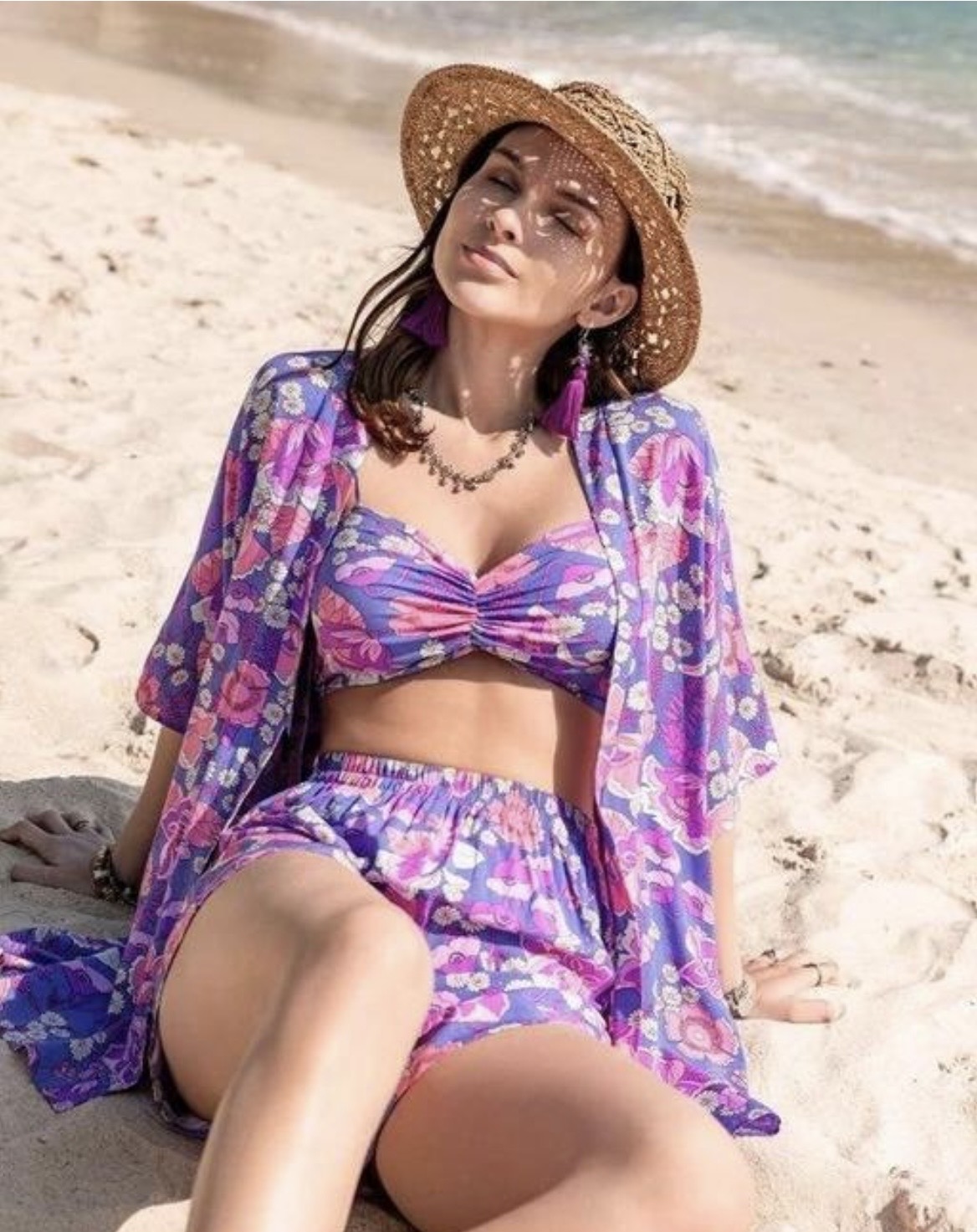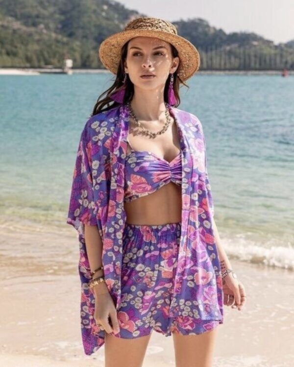Crafted from lightweight polyester fabric, this three-piece set includes a top, bottom, and a stylish shrug for a complete and fashionable outfit. The V-neck design adds a flattering touch to the neckline, while the short sleeves provide comfort and breathability for warm summer days. The vibrant printed pattern enhances the overall appeal, making the outfit look fresh, playful, and perfect for beachside vibes.