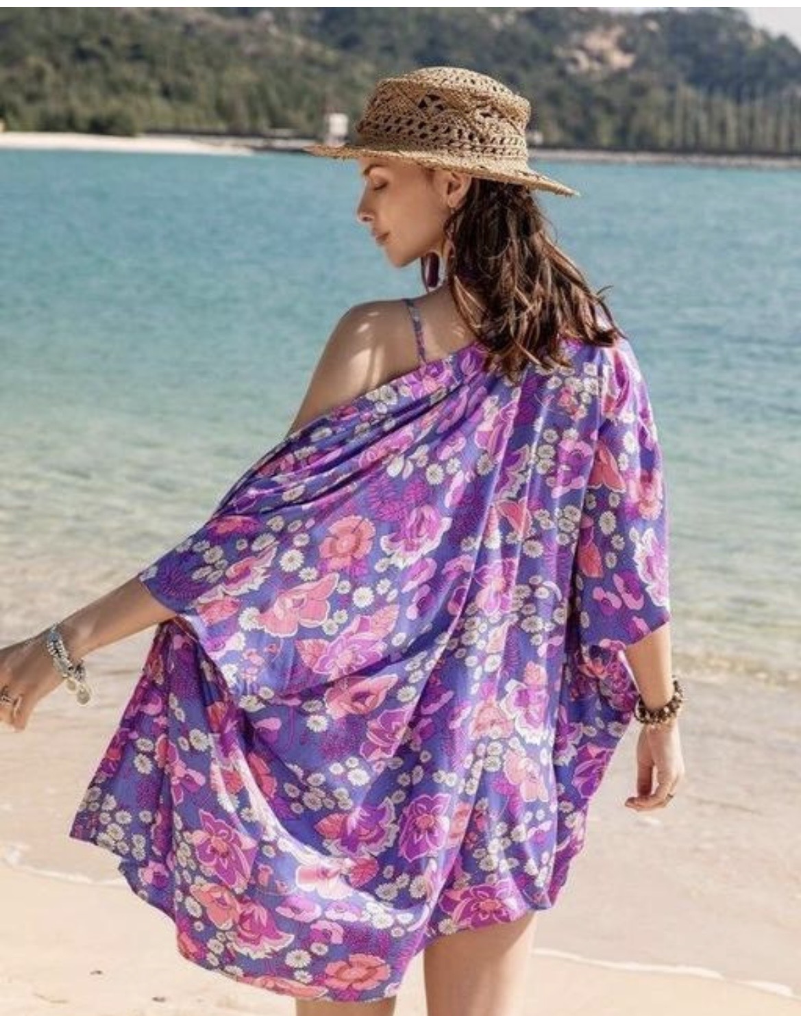 Shop Beach Dresses Summer style in lavender with printed top, bottom & shrug. Lightweight polyester outfit with V-neck & short sleeves, perfect for vacations & beachwear.