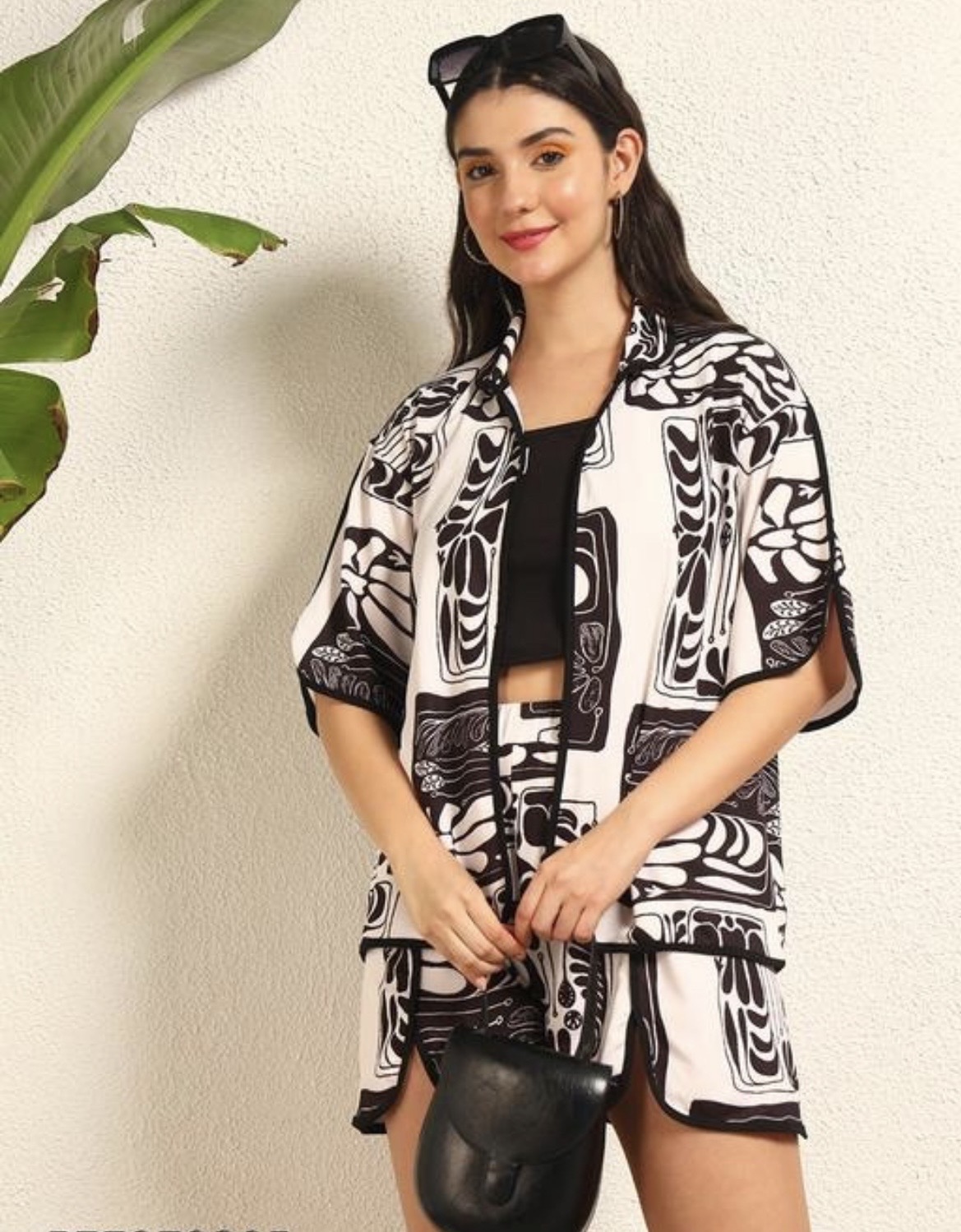 Upgrade your vacation wardrobe with these stylish Beachwear Clothes designed for effortless comfort and modern fashion. This black and white co-ord set features a trendy printed shirt paired with matching shorts, making it a perfect choice for beach outings, poolside lounging, and summer getaways.