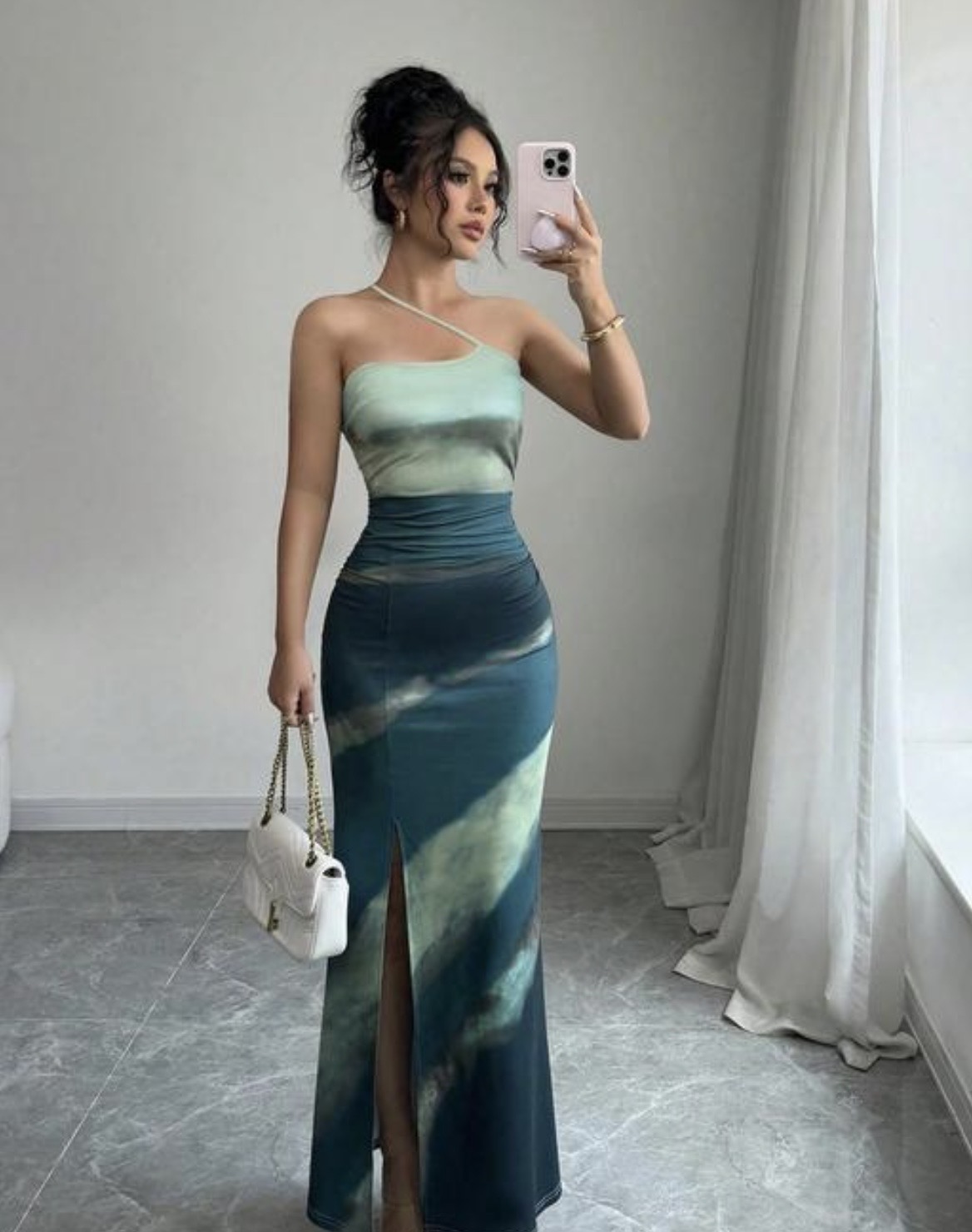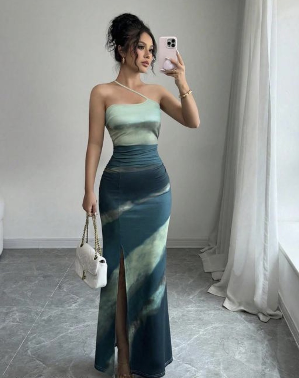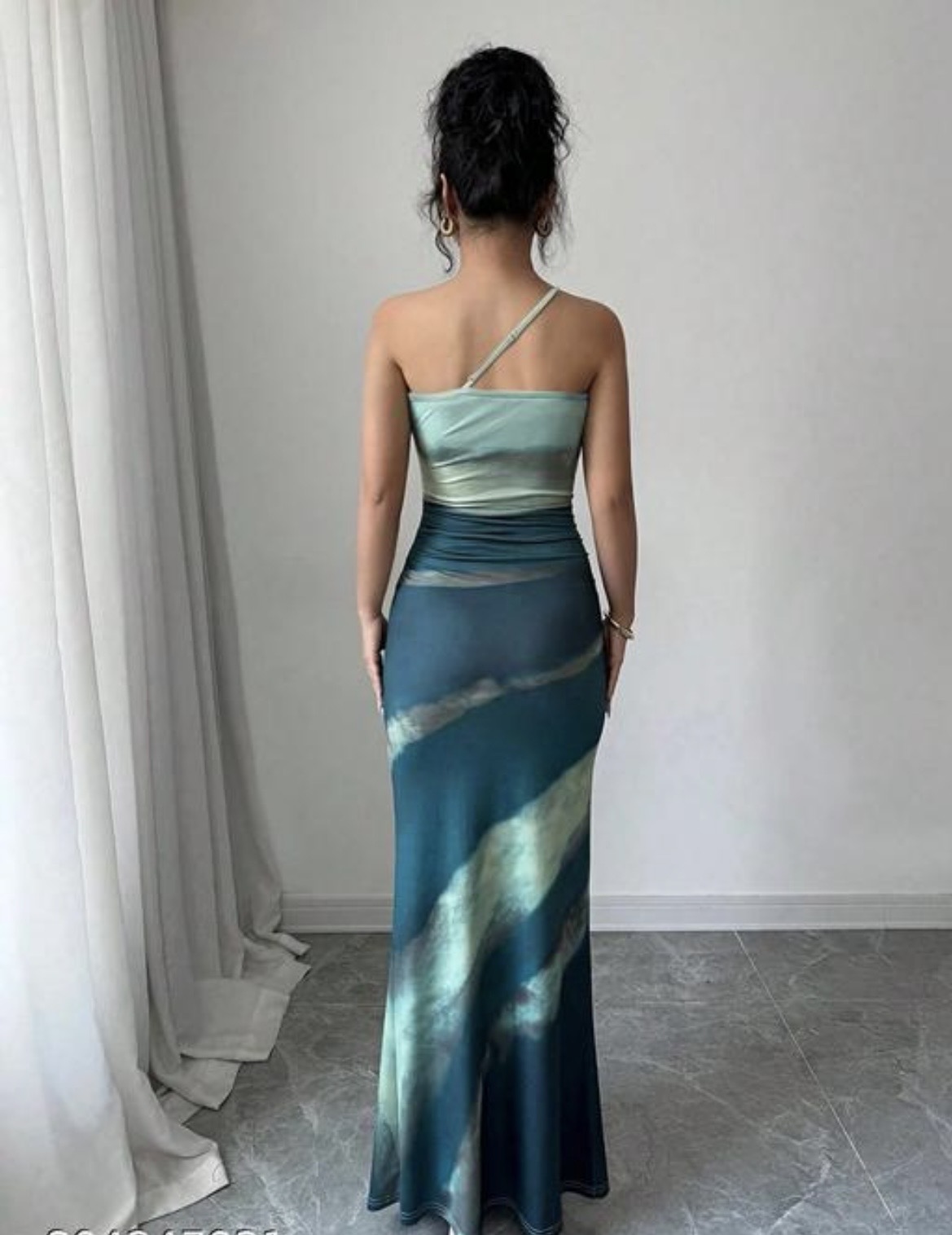 Designed with a stylish shoulder neckline and sleeveless pattern, this dress gives a chic and contemporary appearance while keeping the outfit light and comfortable. The full-length design adds a touch of elegance, making it suitable for both casual events and evening occasions.