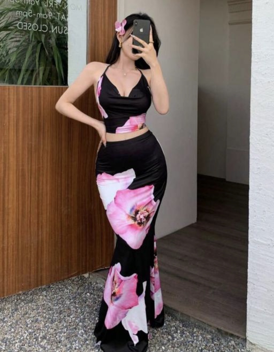 Modern brides are moving away from traditional one-piece gowns toward versatile co-ord sets. Choosing this two-piece as your primary Beach Honeymoon Dress offers incredible value. Not only does it provide a cohesive “runway” look when worn together, but the pieces can also be styled individually. You can pair the halter crop top with denim shorts for a casual excursion or wear the mermaid skirt with a simple white bodysuit for a different evening vibe. This versatility allows you to pack light while staying stylish throughout your trip.