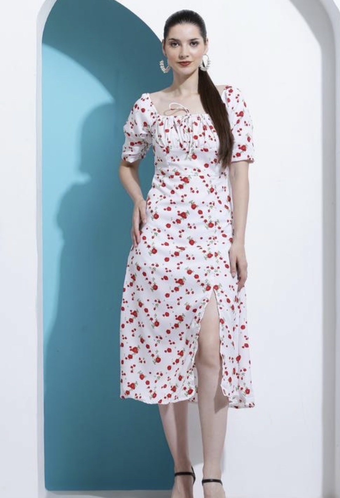 Crafted from lightweight crepe fabric, this one-piece dress offers a soft, flowy drape that flatters every movement. The fit and flare silhouette enhances your natural shape, creating a graceful and feminine appeal. Designed in a refreshing white shade with a delicate floral print, it captures the essence of romance and summer vibes beautifully.