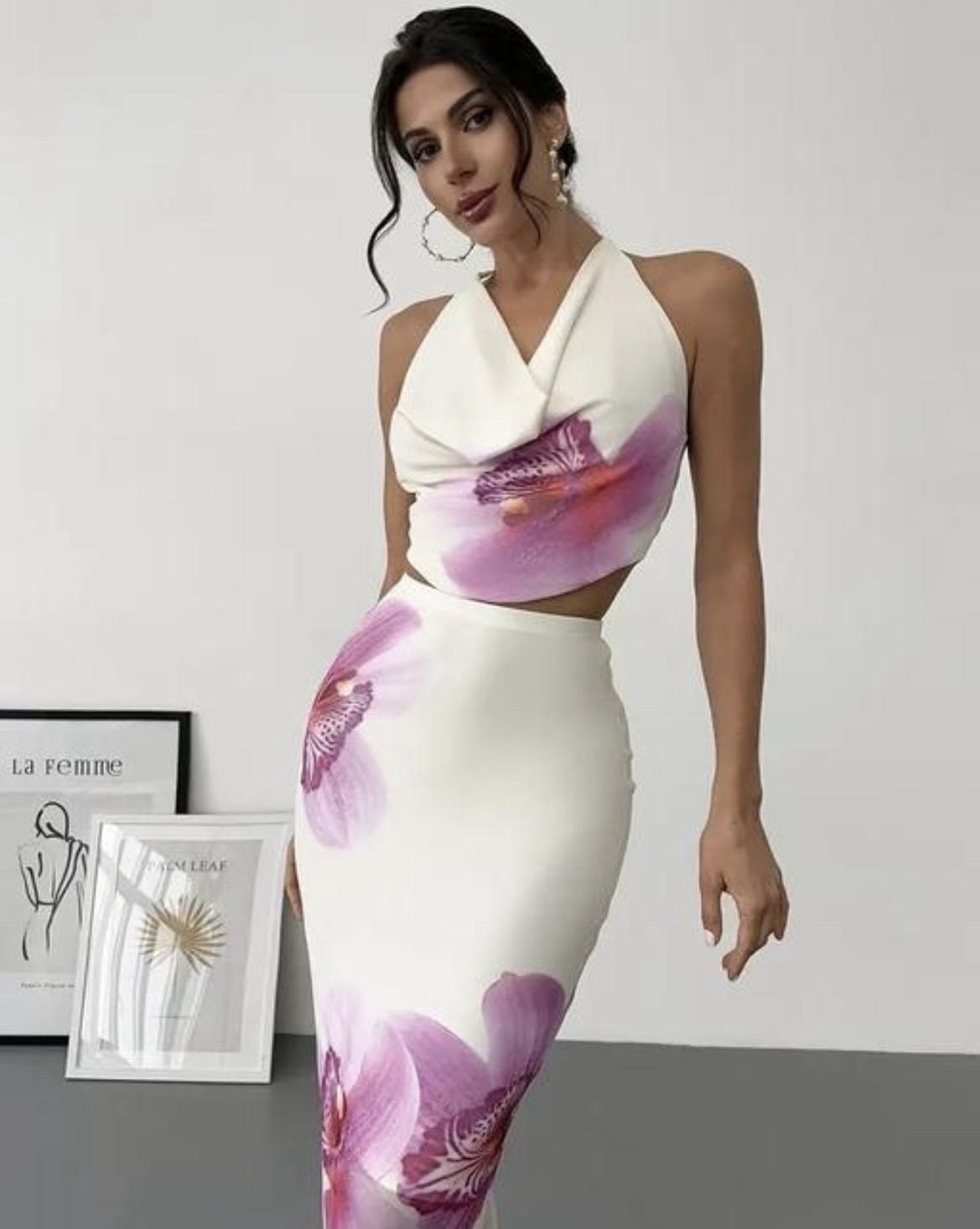 This stunning 2-piece set features a trendy off-shoulder design that highlights your shoulders while adding a romantic and feminine touch. Crafted with a flattering V-neck style and sleeveless pattern, the outfit keeps you cool and comfortable even during hot summer days. The delicate floral printed pattern enhances its charm, creating a fresh and vibrant beach-ready look.
